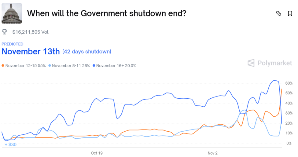 ตลาดคาดการณ์อย่าง Polymarket และ Kalshi ชี้ว่าความน่าจะเป็นที่การปิดหน่วยงานรัฐบาลจะสิ้นสุดลงในช่วงสัปดาห์นี้เพิ่มขึ้นอย่างมาก โดยเฉพาะในวันพฤหัสบดี ด้วยโอกาสที่เพิ่มขึ้นจากเพียง 27% เป็น 54% ภายในหนึ่งวัน