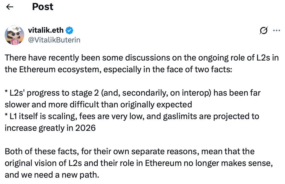 "วิสัยทัศน์เดิมของ L2 และบทบาทที่มีต่อ Ethereum อาจไม่สมเหตุสมผลอีกต่อไป เราจำเป็นต้องหาเส้นทางใหม่" Vitalik Buterin ผู้ร่วมก่อตั้ง Ethereum เคยโพสต์ข้อความผ่าน X ซึ่งสะท้อนถึงความกังวลต่อระบบ Sequencer ที่ยังรวมศูนย์และกลไกสะพานเชื่อมที่ไม่เสถียร