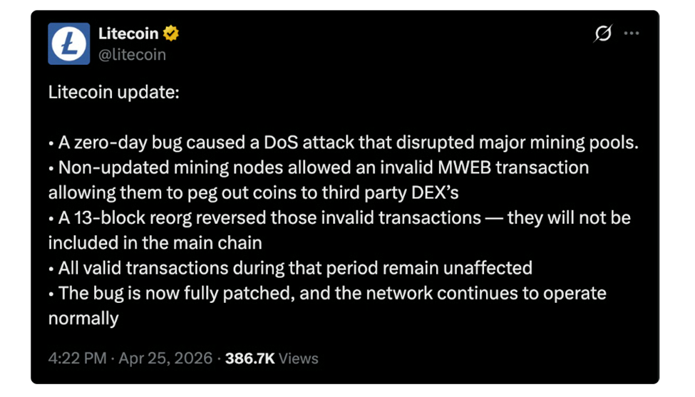 ทีมพัฒนา Litecoin ระบุว่าเครือข่ายถูกโจมตีผ่านช่องโหว่ที่อ้างว่าเป็น “Zero-day” (ช่องโหว่ที่ไม่เคยถูกค้นพบมาก่อน) โดยเป้าหมายหลักคือการทำ Denial of Service (DoS) ใส่ Mining Pool ที่เพิ่งอัปเดตซอฟต์แวร์เวอร์ชันล่าสุด ส่งผลให้แรงขุด (Hashrate) ของโหนดเหล่านี้ลดลงอย่างกะทันหัน
