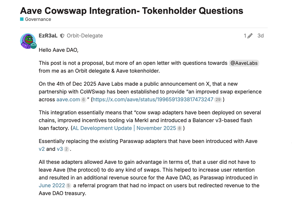 ประเด็นร้อนนี้ถูกยกขึ้นโดยสมาชิก Aave DAO นามแฝง EzR3aL ซึ่งตั้งข้อสังเกตว่าค่าธรรมเนียมที่เกิดขึ้นจากการแลกเปลี่ยนสินทรัพย์ดิจิทัลผ่าน CoW Swap นั้น ไม่ได้ไหลเข้าสู่คลัง (Treasury) ของ Aave DAO แต่กลับถูกส่งไปยังที่อยู่บนเชนส่วนตัวที่ควบคุมโดย Aave Labs
