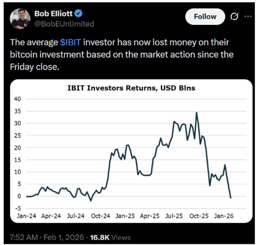 จากข้อมูลของ Bob Elliott ประธานเจ้าหน้าที่ฝ่ายการลงทุนของ Unlimited Funds ระบุว่า เมื่อพิจารณาจาก Dollar-weighted flows (การคำนวณผลตอบแทนที่ถ่วงน้ำหนักตามจำนวนเงินลงทุนที่ไหลเข้า) พบว่านักลงทุนส่วนใหญ่ที่เข้าซื้อ IBIT กำลังตกอยู่ในสภาวะ "ขาดทุน" หลังจากตลาดปิดตัวลงเมื่อวันศุกร์ที่ผ่านมา